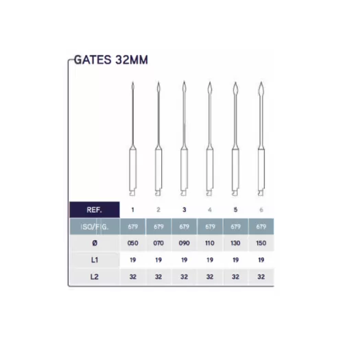 Gates Glidden are stainless steel burs with long shank and flame-shaped ends used for preparation of the coronal third of the canal and for eliminating interferences.