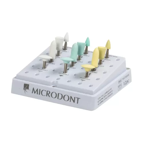 This kit is composed by points assembled to the mandrel, suitable for finishing and polishing the glass ionomers or composites. The sequence of use is: green > yellow > white