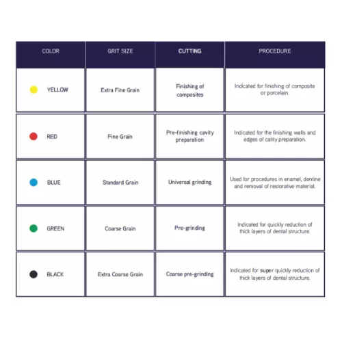 Diamond bur is an abrasive device used to perform the dental preparation by wearing enamel and dentin, direct restorative material removal and is also suitable for adjusting prosthetic parts (composites, porcelain or metal).